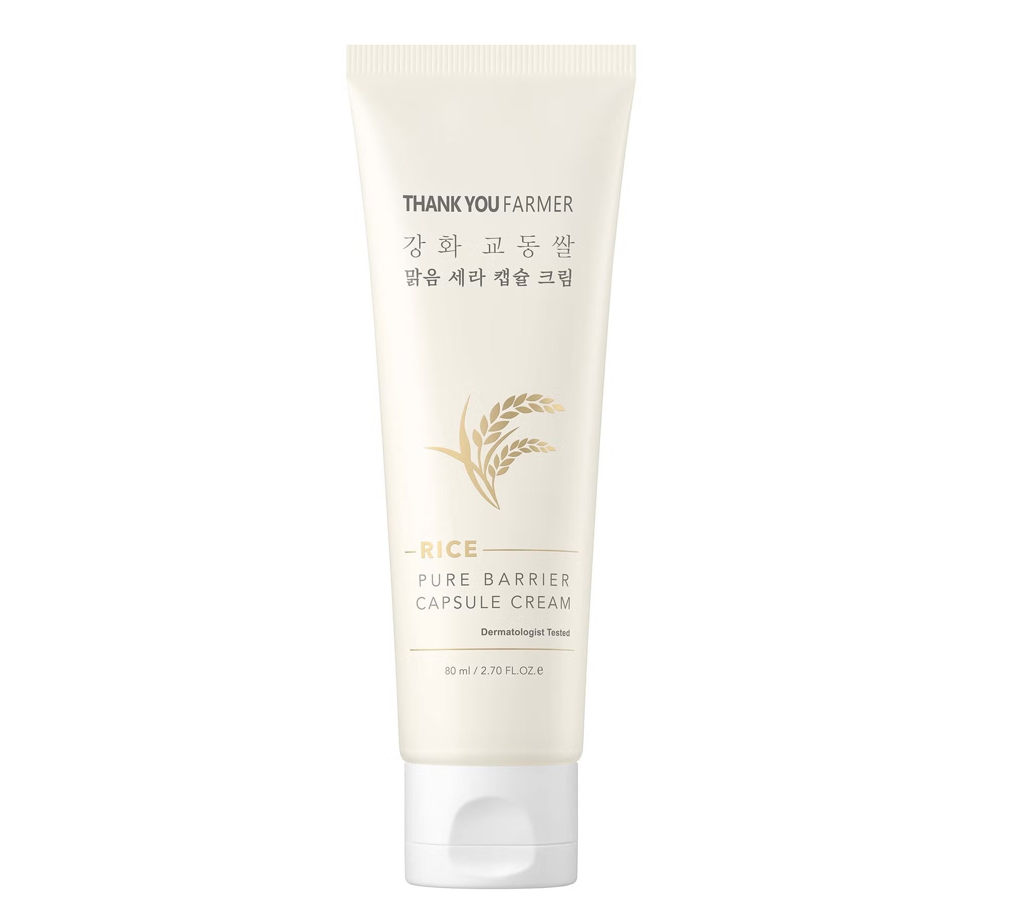 Thank You Farmer Rice Pure Barrier Capsule Cream este o cremă vegană de îngrijire intensivă, cu orez, ceramide și niacinamidă, concepută pentru a repara și întări bariera cutanată în timp ce uniformizează și netezește textura pielii. Formula combină ingrediente umectante, emoliente și fortifiante într-un sistem de livrare delicat, capsule de ceramidă, pentru protecție continuă împotriva agresiunilor externe, fără a oferi o senzație lipicioasă.