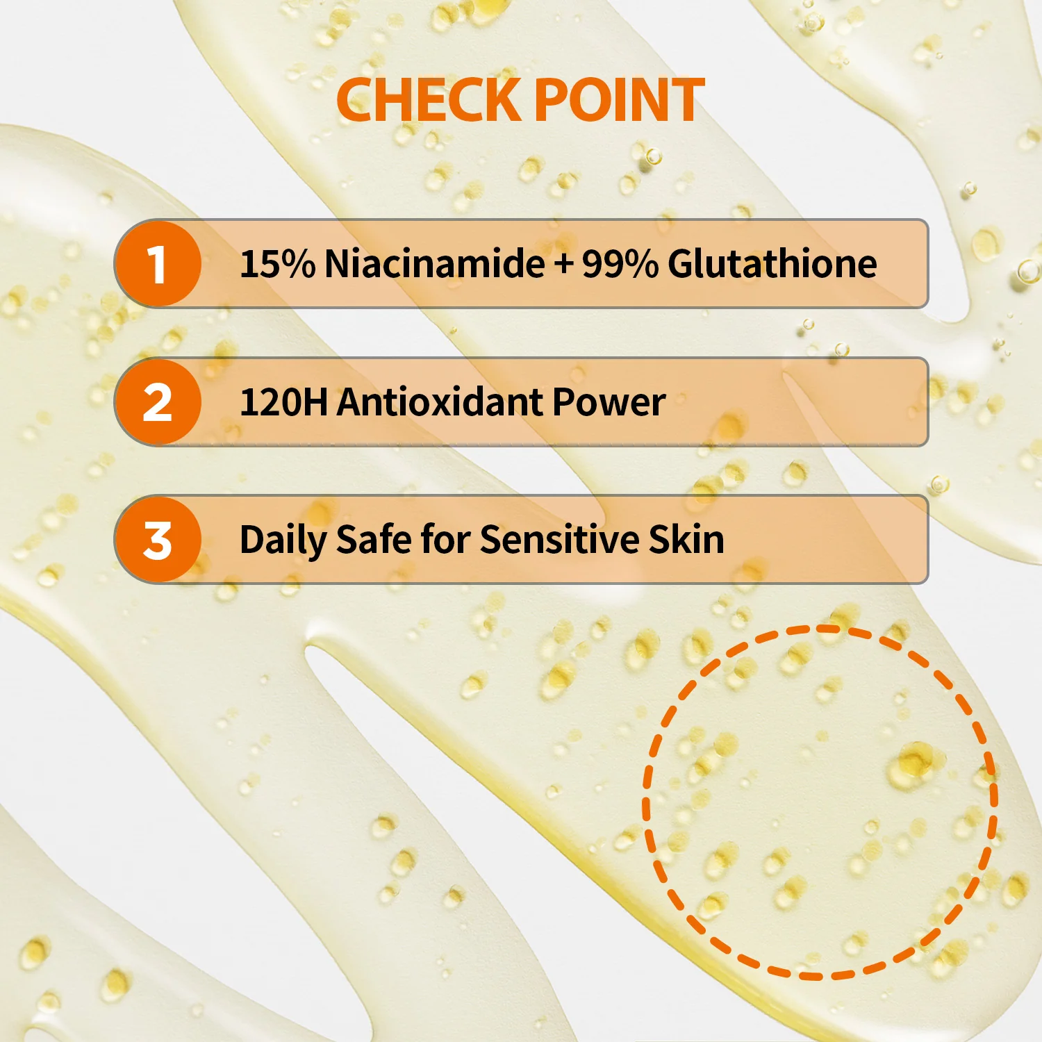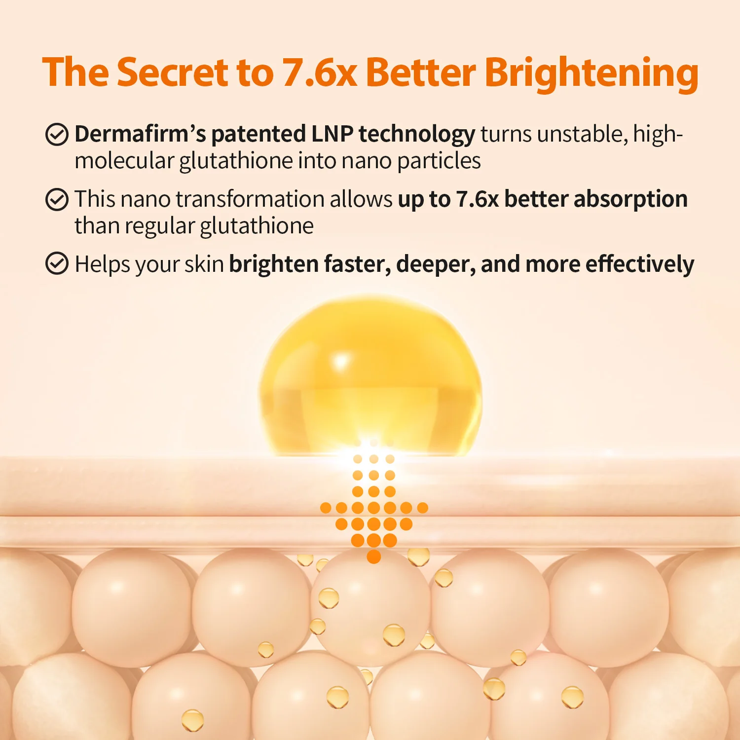 - Glutathione Nano Brightening™: glutation stabilizat încapsulat în nanoparticule lipidice pentru o penetrare și stabilitate superioară; acționează ca antioxidant puternic, inhibând producția de melanină și contribuind la efectul de iluminare pe termen lung.