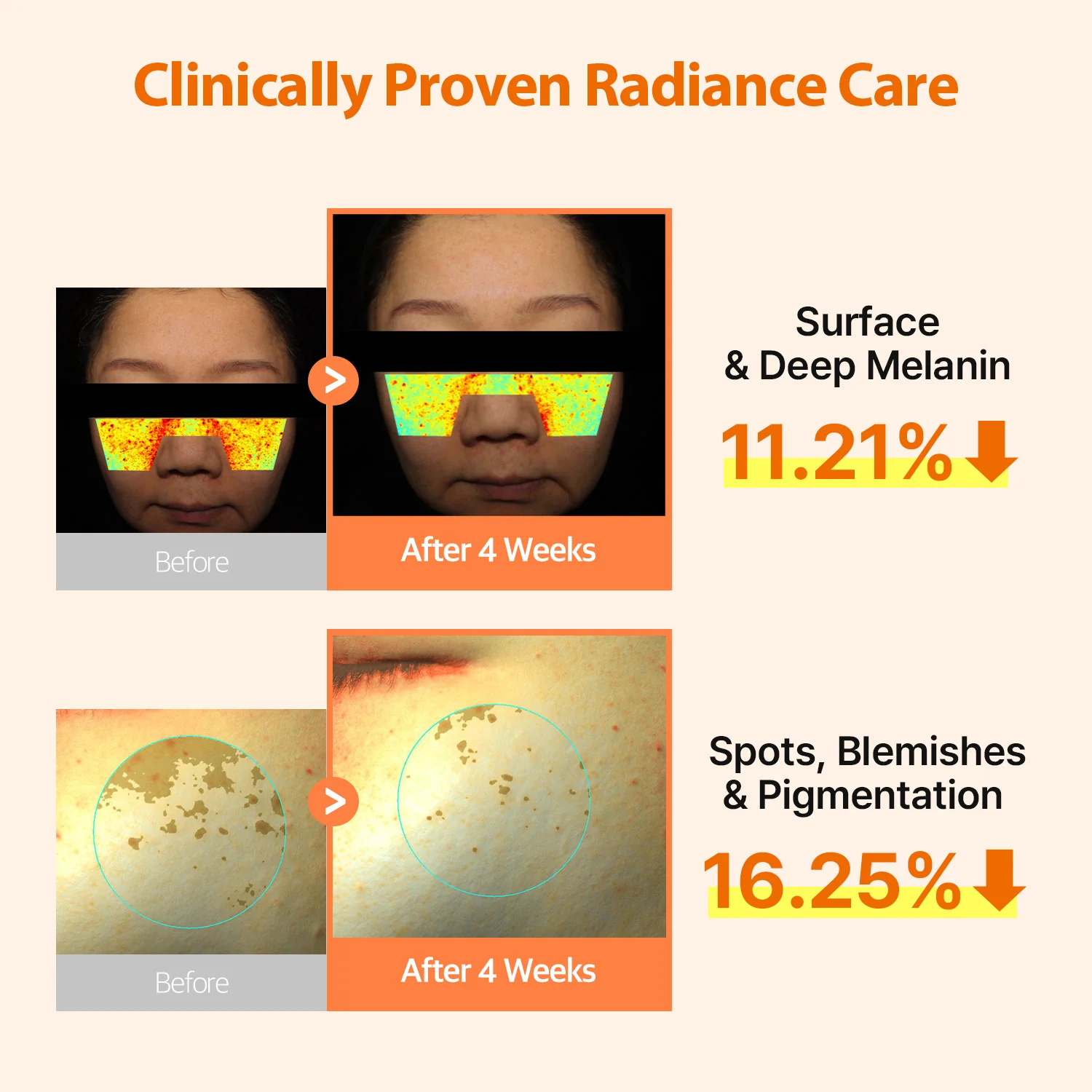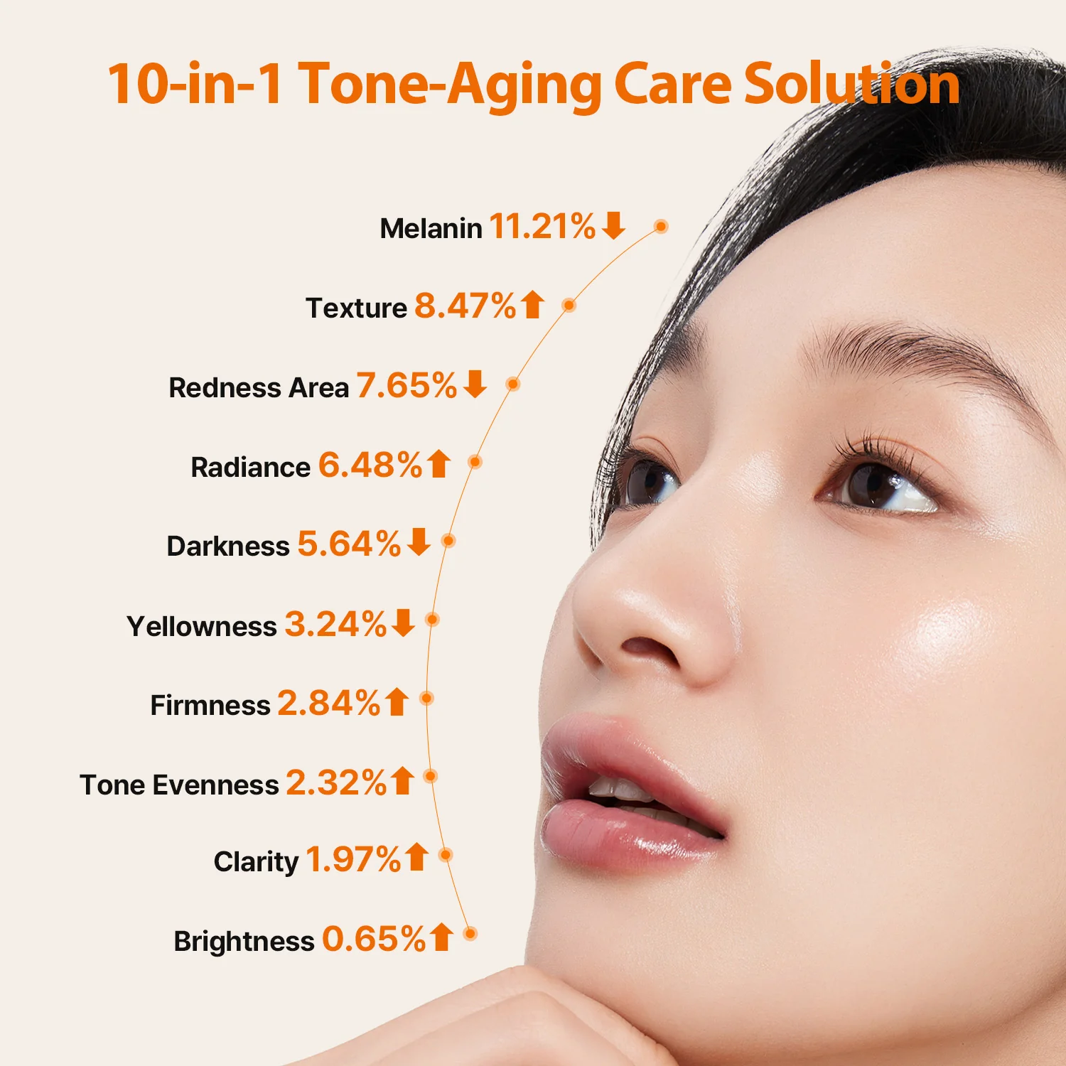 - Îmbunătățește 10 indicatori de îmbătrânire a tonului pielii (pigmentare, aspect tern, pete solare, uniformitate, luminozitate etc.).